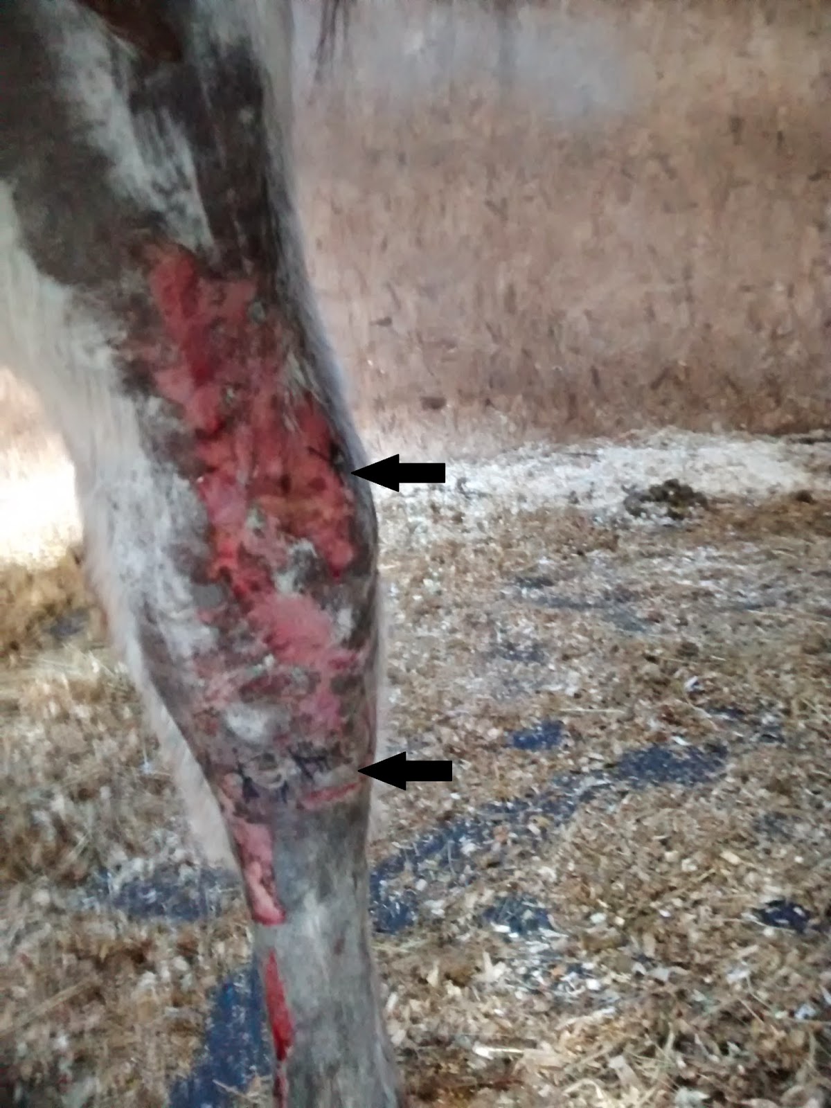 On day 5 I got a chance to see what was under the bandages......the arrows show where there are stitches, The bottom arrow is the "big" wound.